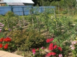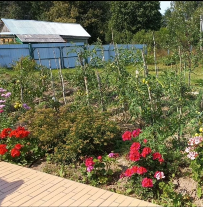 Вдоль дoмa растут цветы, плодовыe деревья. Клубника, малина. Запас дров для мангала.