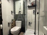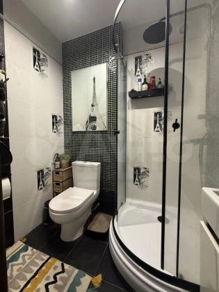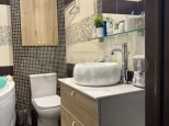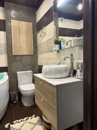 Два Функциональных Санузла: Забудьте об утренних очередях! У входа вас встретит гостевой санузел с душевой кабиной, унитазом и раковиной. В приватной зоне расположена вторая ванная комната с полноценной ванной, унитазом, стильной раковиной-чашей на каменной столешнице, удобной системой хранения над унитазом и выделенным местом для стиральной машины.