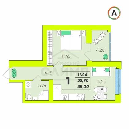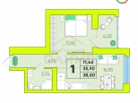 • Общая площадь 38 кв.м, площадь кухни 16,55 кв.м.